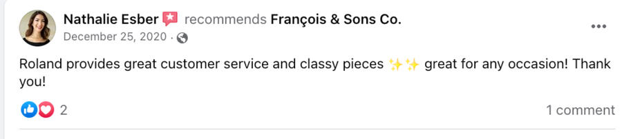 Unlike most jewelry stores, you will not be met by a pushy salesperson trying to sell inventory.Do you have an existing piece of jewlery you would like us to draw inspiration from?Was there an exquisite piece you saw on Pinterest that you'd like us to replicate, but be made to fit you perfectly?François & Sons Co is dedicated to creating what you want, not selling what we have.